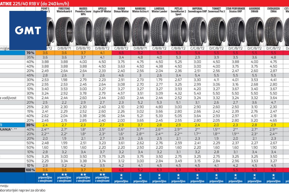 Za bogato izbiro pnevmatik vseh vrst in dimenzij se enostavno oglasite v eni izmed mnogih trgovin GMT Avtodeli po celi Sloveniji, kjer vam bodo naši strokovnjaki z veseljem svetovali. Vseeno pa ne bo škodilo, če boste poprej preleteli najaktualnejši test zimskih pnevmatik, ki so ga zopet izvajali veliki evropski avtomobilski klubi (med njimi tudi AMZS, ADAC, ÖAMTC).